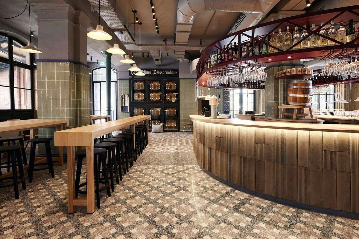 Tradition has been redefined at the Benediktiner Weissbräuhaus in Giessen. The successful blend of old and new has created a rustic, modern flair with cosy and inviting rooms. The skilful alternation of patterns and single-coloured tiles made of coarse terrazzo creates ornamentation and pathways. Expectations of a brewery are fulfilled and far exceeded. Cheers!