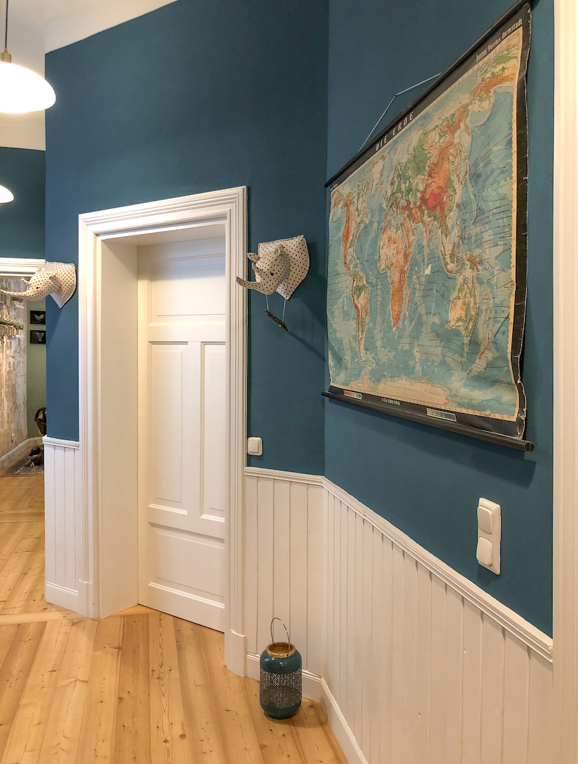Flur in petrolblau gestrichen mit Türe und Wandpaneelen in Milchschaum an der Wand eine historische Schullandkarte