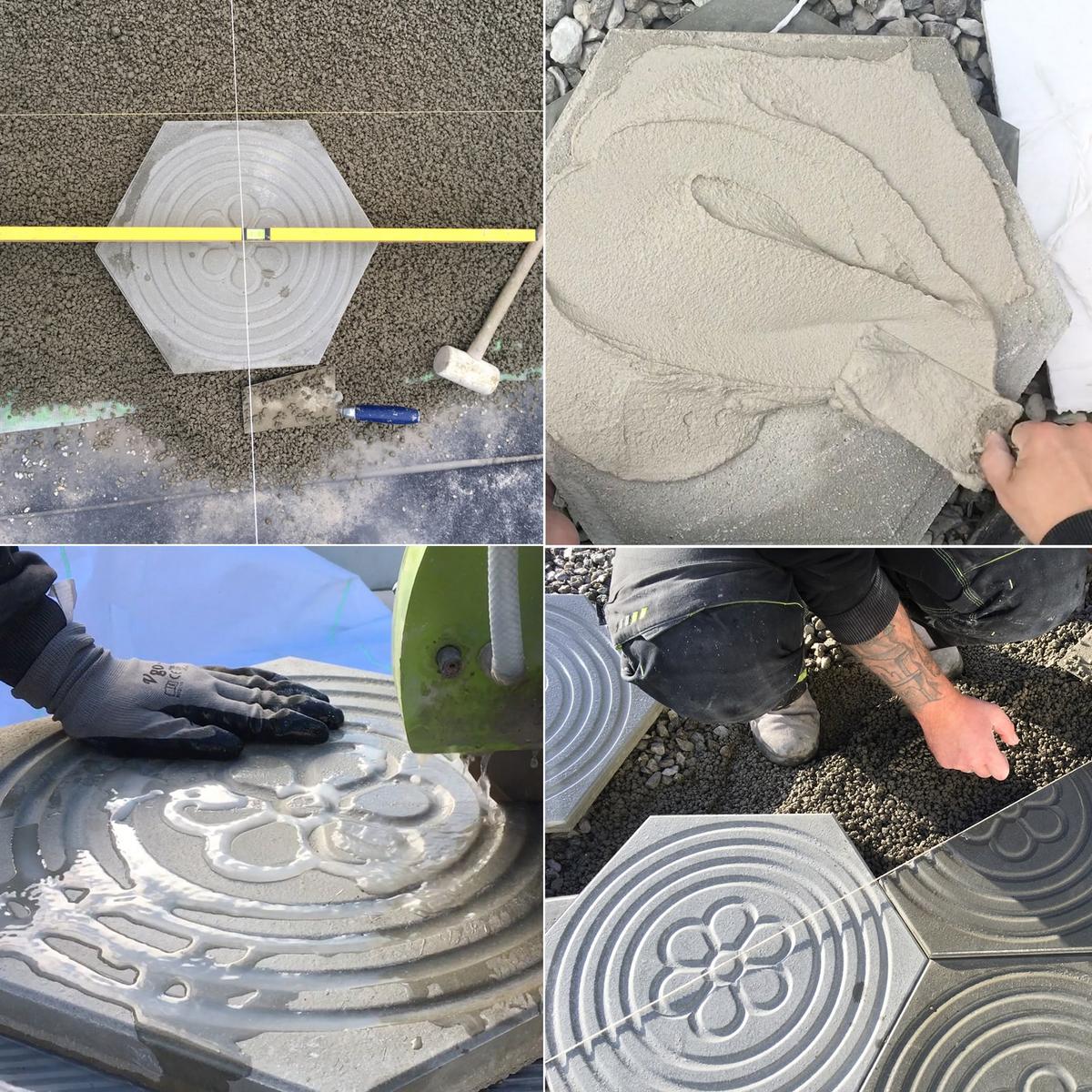 Die quadratischen und sechseckigen Platten werden direkt auf Stoß verlegt und nicht verfugt. Es entsteht eine homogene Fläche, wie aus einem Guss.