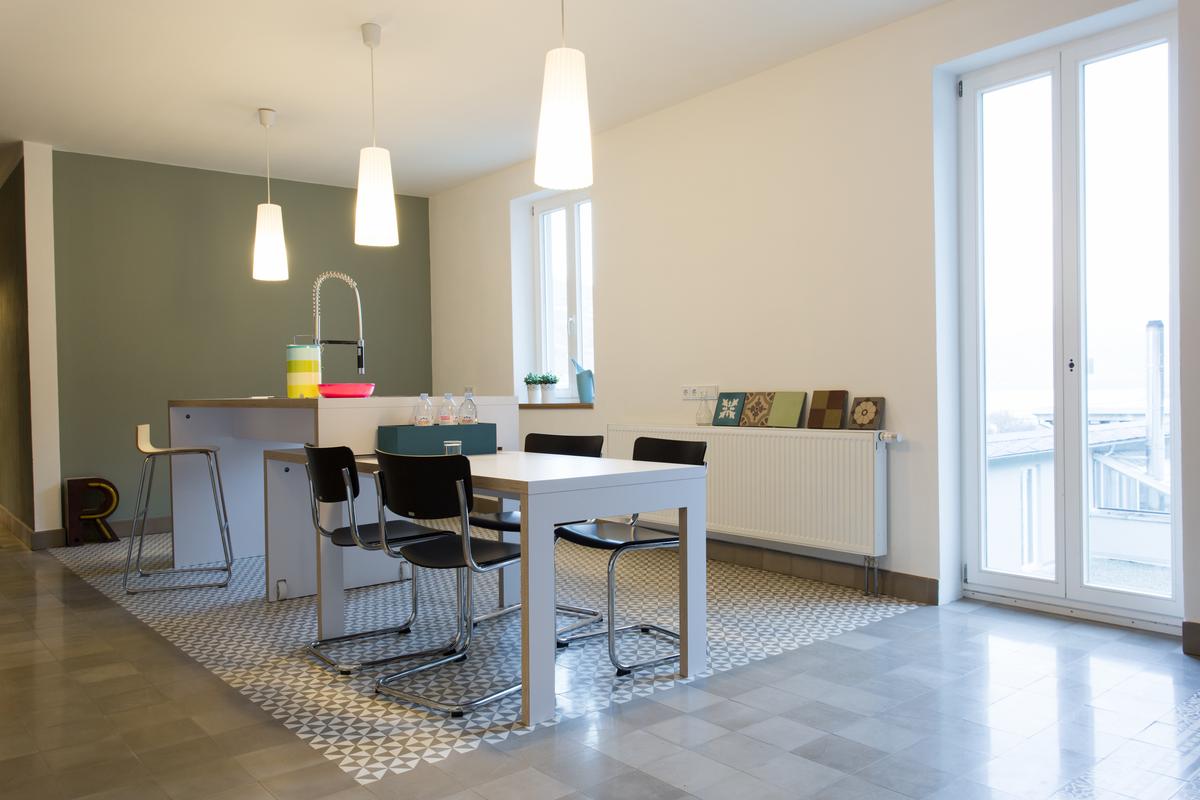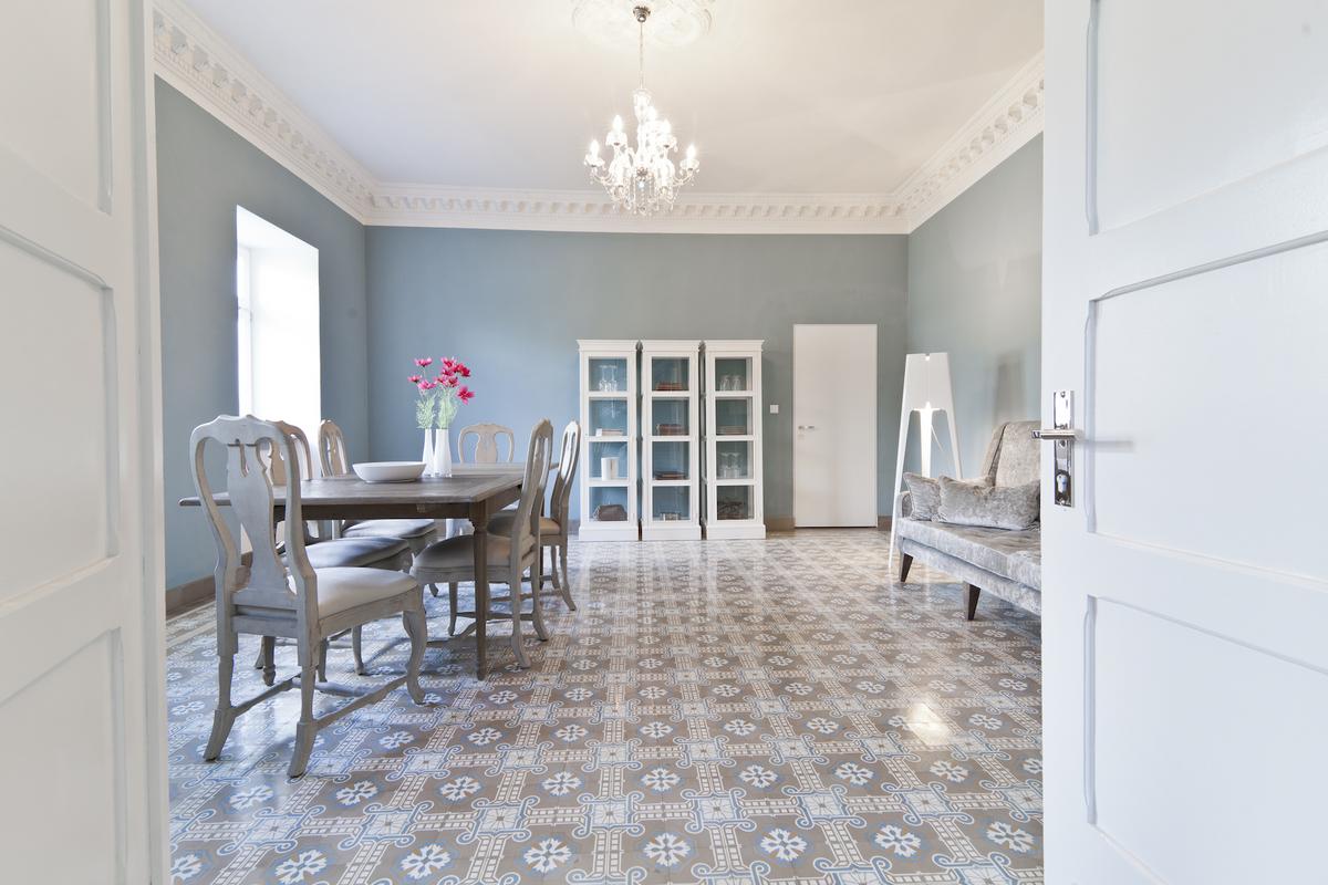 Herausforderung und Chance zugleich, denn das zwischen 1913 und 1921 als repräsentatives Château gebaute Ensemble, dessen Fertigstellung die beiden Weltkriege verhinderten, stand unter Denkmalschutz und hatte gleichzeitig Potenzial für Veränderung und Erweiterung. In der Eingangshalle hängt heute die Zeichnung des ursprünglichen, fast doppelt so groß geplanten Gebäudeentwurfs, die ein Ehepaar beim Aufräumen des Speichers fand und den Firmeninhabern schenkte. Statt Sekt lagern nunmehr Zementmosaik-, Terrazzo- und Trottoirplatten sowie Wandfarben in den langen Gewölbegängen, die von der 1.000 qm großen, neuen Glashalle aus in die ganze Welt geliefert werden. Auch lebt der Repräsentationsgedanke des Sekthauses weiter in den Ausstellungs- und Büroräumen. Am eindrücklichsten ist dies im Blauen Salon mit umlaufendem Stuckfries, korrespondierenden VIA-Bodenplatten und spektakulärem Rheinblick zu erleben. Die Philosophie des Unternehmens weiter, doch nicht fertig zu bauen, lässt Raum für zukünftige Veränderungen: gelebte Baukultur zwischen Altem und Neuem!